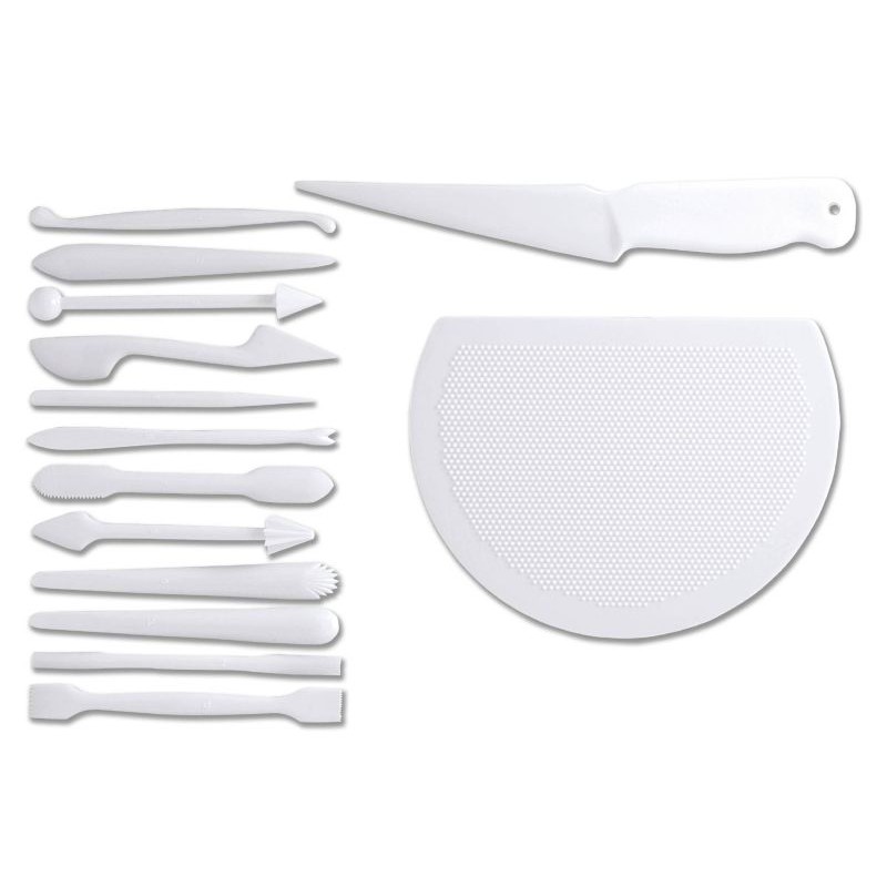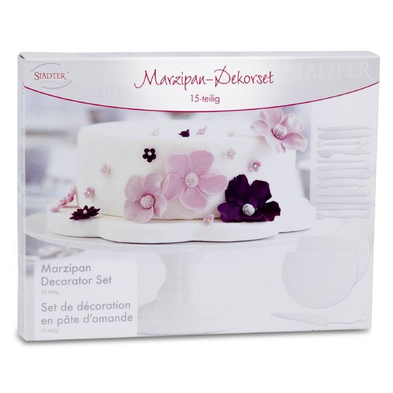 sada obsahuje 15 kusov modelovacích pomôcok, súčasťou sady je aj nôž na marcipán a podložka na otláčanie stredov kvetov.