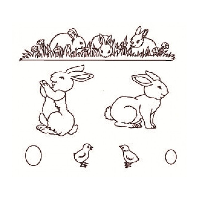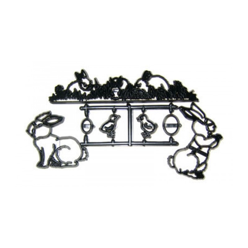 Vykrajovač patchworku s veľkonočným motívom. Súprava obsahuje: 2x zajac veľký = 8 x 5,5cm a 5,8 x 6,2cm 1x trávnatý pruh s postavičkami 3 zajacov 15,7 x 3,2cm 2x kuriatko 2,3cm vysoké 2x vajíčko 2 a 1,3cm sada celkom obsahuje 7 kusov. Materiál plast